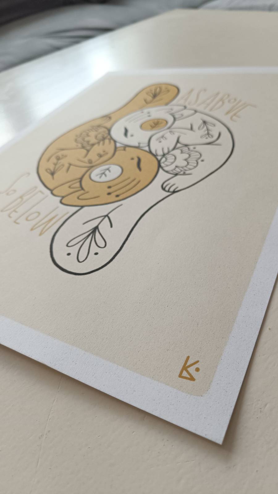 To graficzna opowieść o harmonii i wzajemnym przenikaniu się dwóch światów, ujęta w formę zwierzęcego symbolu yin-yang. Ilustracja wizualizuje starożytną zasadę „As Above So Below”, sugerując, że wszechświat i nasze wewnętrzne „ja” stanowią nierozerwalną jedność. Dwie sylwetki, splecione w wiecznym uścisku, tworzą krąg życia, w którym odpoczynek spotyka się z czujnością, a światło z cieniem.