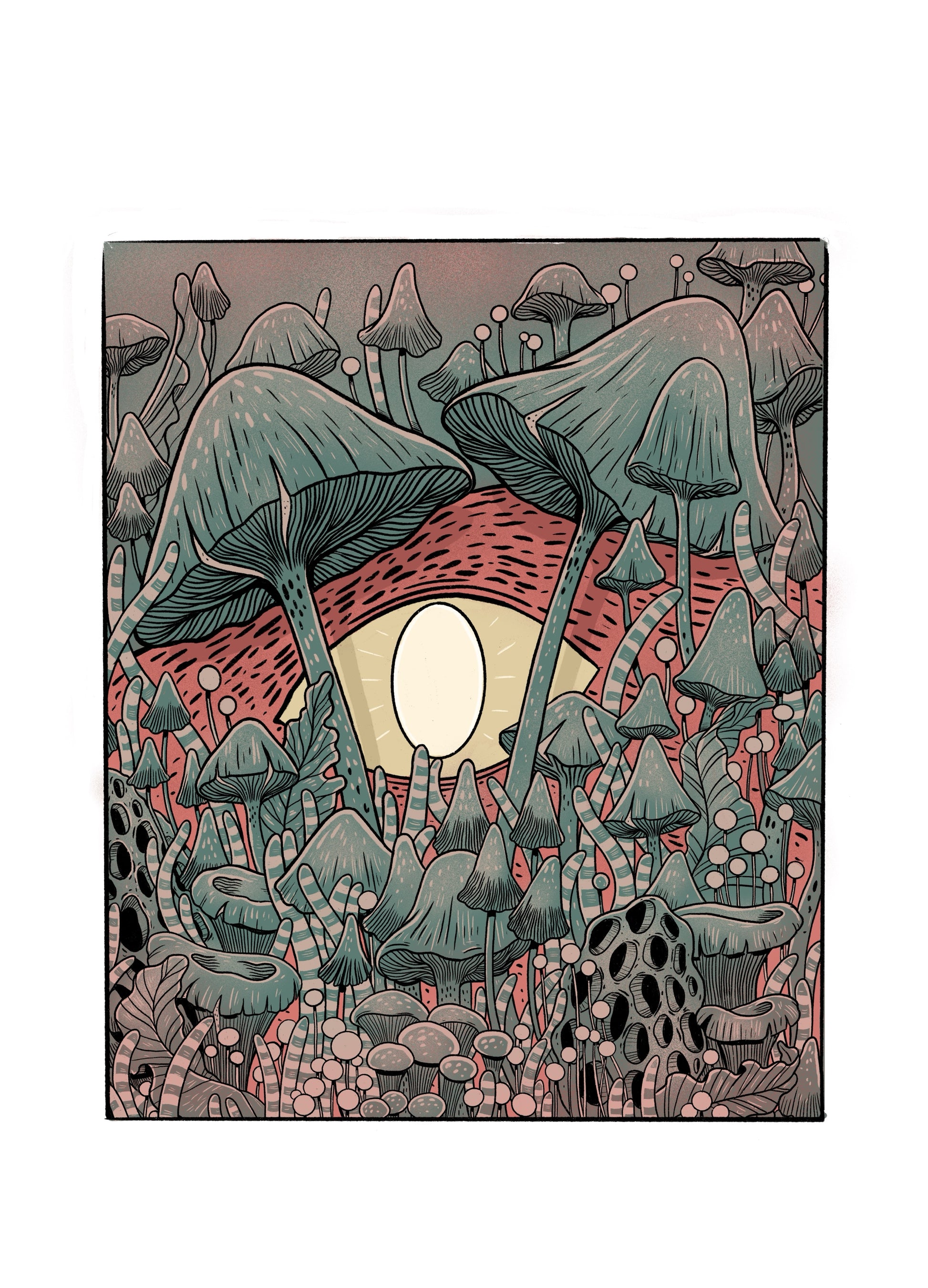 Ilustracja przedstawia gęsty, niemal autonomiczny świat form organicznych, w którym centrum stanowi ukryte oko. Zanurzone w strukturach kapeluszy, łodyg i porowatych kształtów. Kompozycja buduje napięcie między obserwowaniem, a byciem obserwowanym.